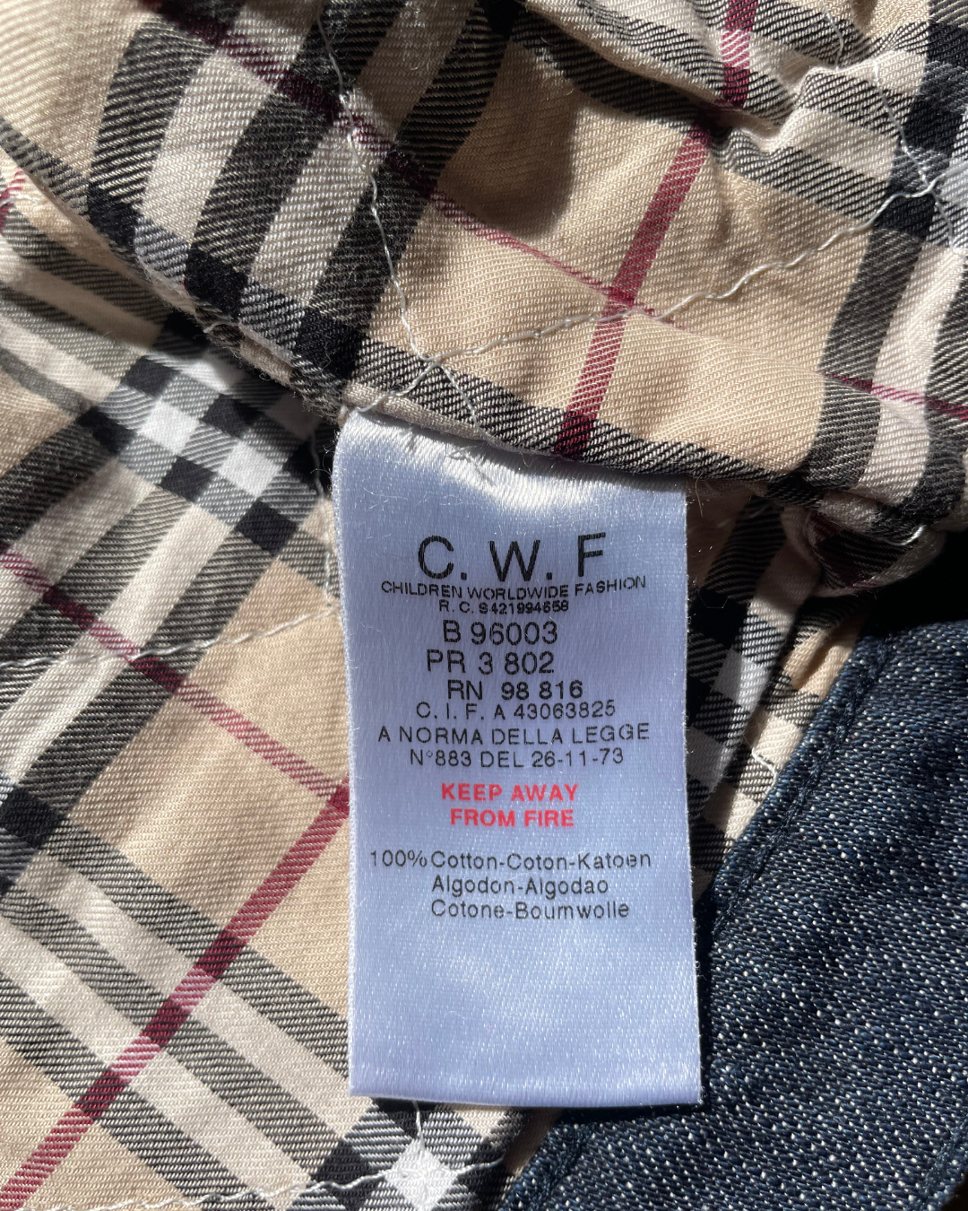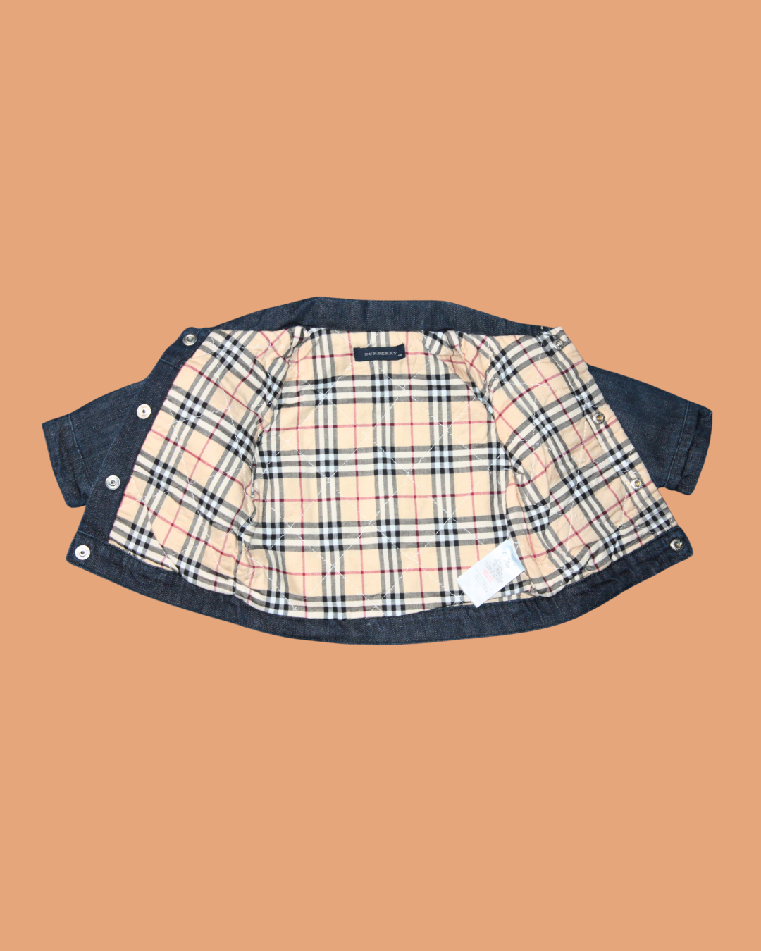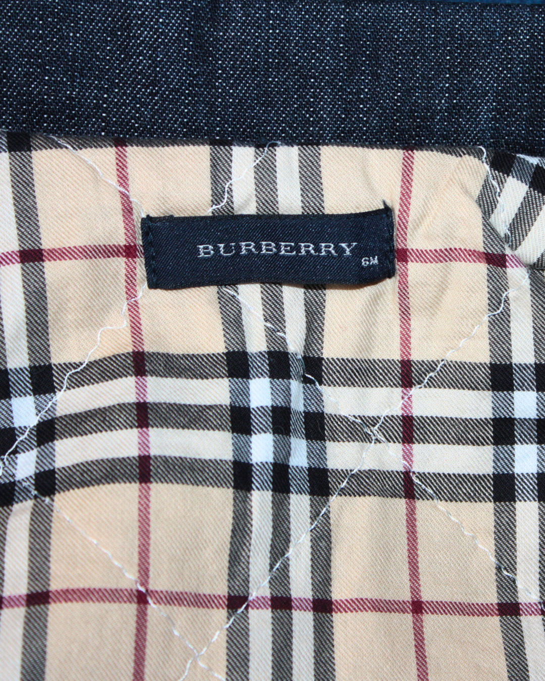 Veste en jean brut Burberry. Des surpiqures blanches ornent le col et les poches poitrine. L'intérieur est entièrement doublé de coton au motif appelé "Burberry check", les fameux carreaux écossais de la marque, reconnaissables entre mille.