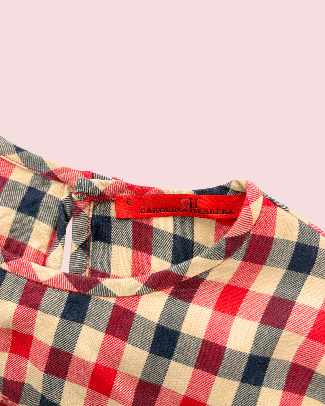 Robe Carolina Herrera à carreaux rouge et bleu marine, manches longues, avec volants délicats sur le devant et le dos, et deux poches pratiques. Elle peut se porter avec des collants en hiver.
