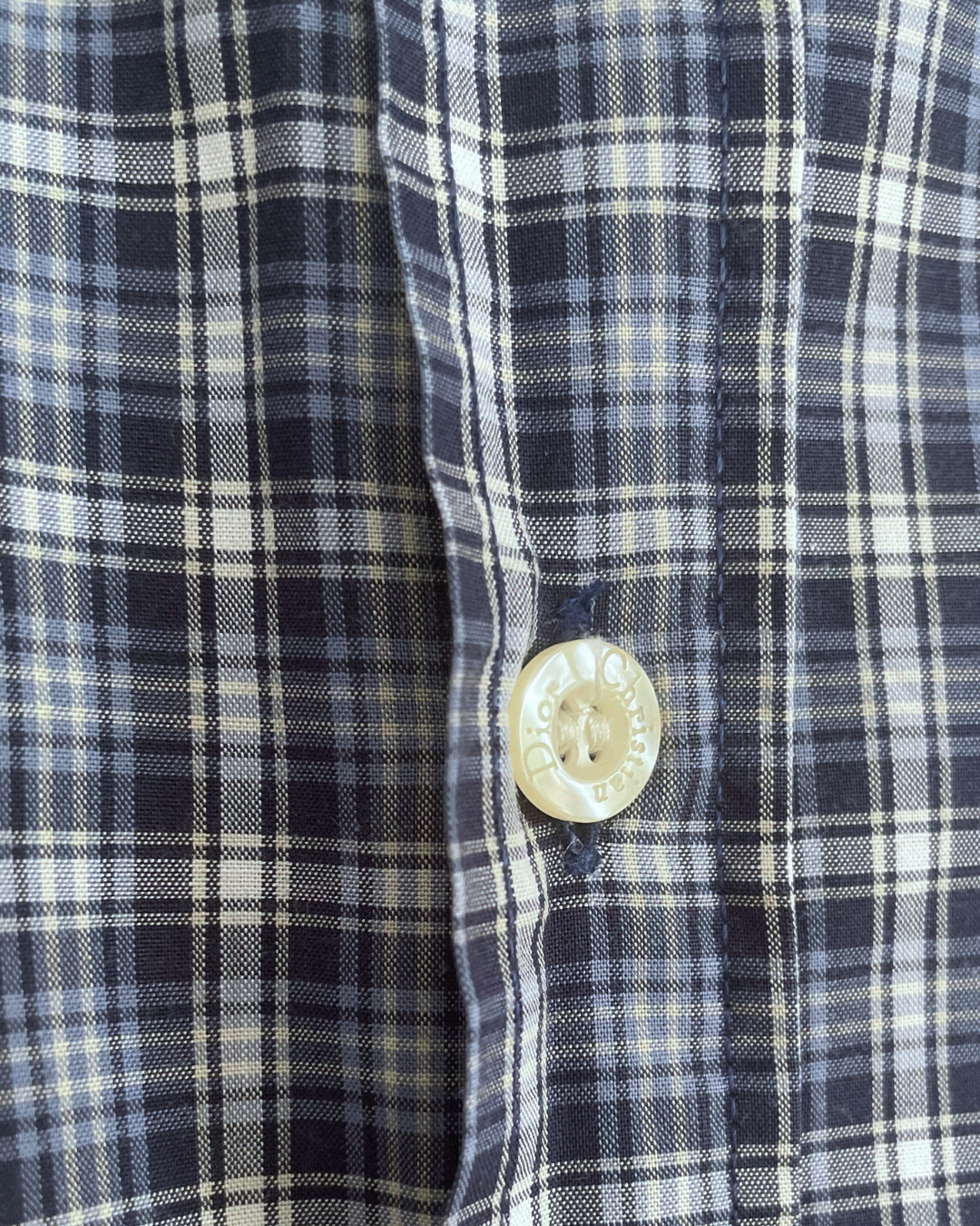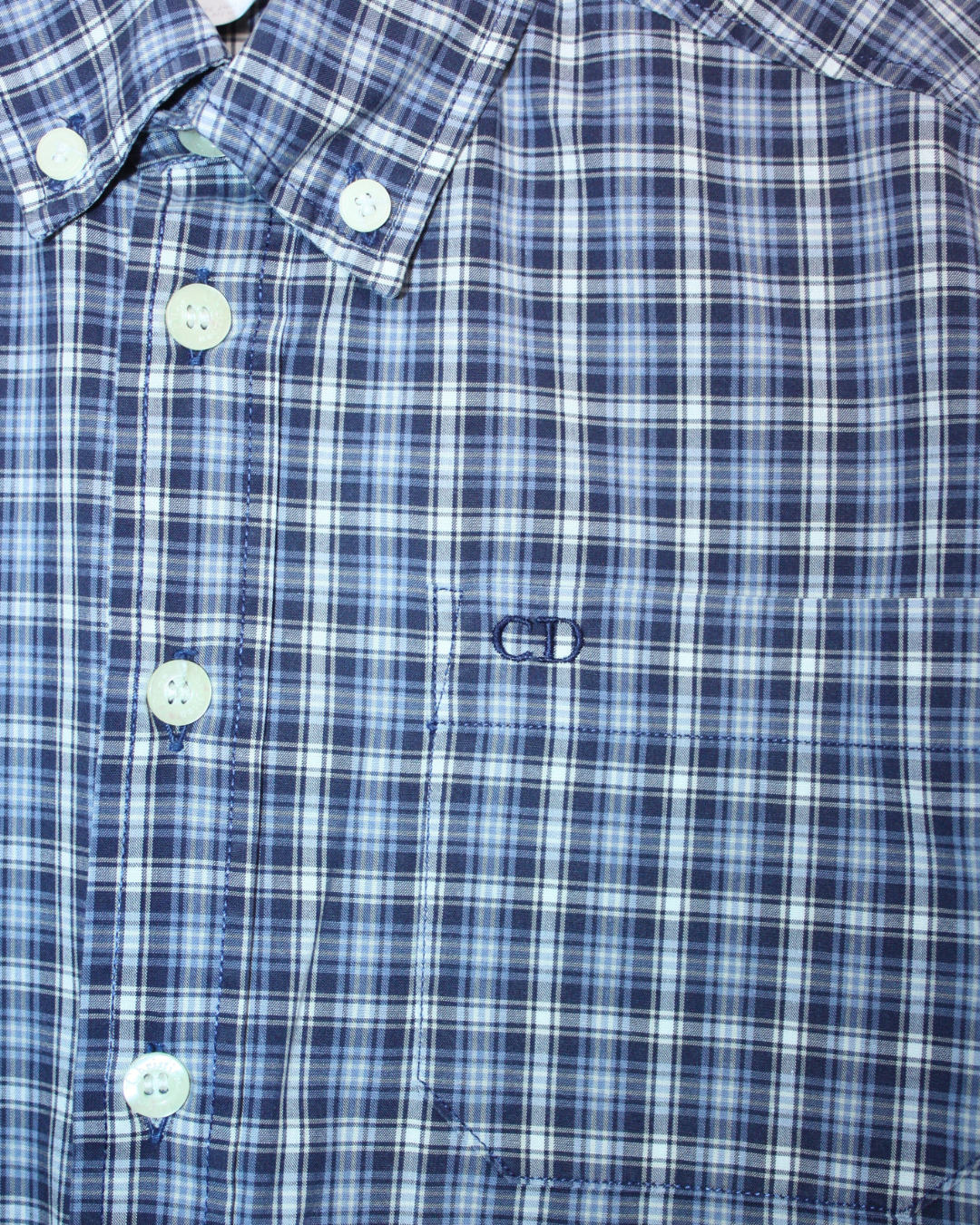Chemise Christian Dior vintage à carreaux bleus en coton léger, elle a une coupe large style années 90s et les initiales CD sont brodées sur la poitrine. Elle est parfaite pour l'été.