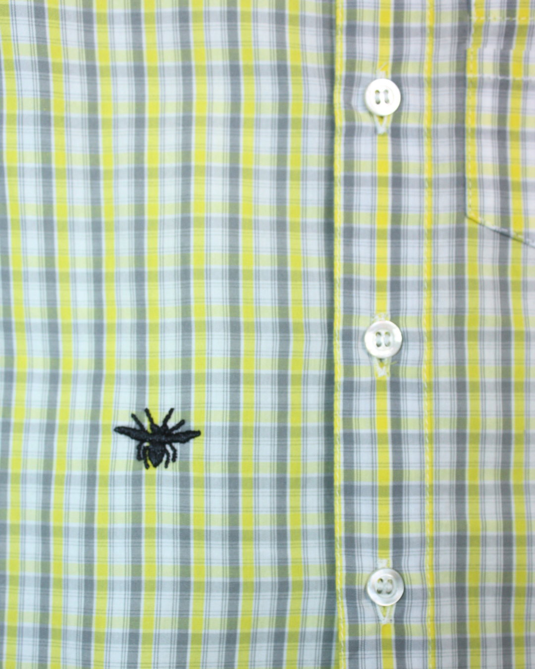 Chemise Baby Dior à manches courtes en coton léger à carreaux dans les tons jaunes et verts. Elle arbore une abeille noire brodée — signature emblématique de la maison Dior. Elle est parfaite pour l'été.