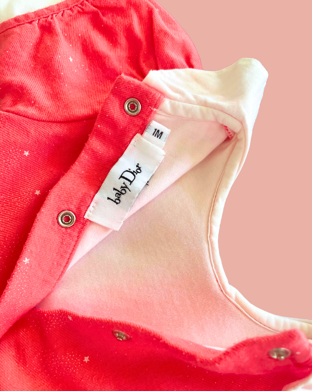 Jolie grenouillère Baby Dior vintage en coton blanc et rose décoré de petites étoiles et d'un col avec noeud papillon. Des boutons pressions dans le dos et l'entrejambe. Elle sera parfaite pour accompagner bébé dans ses premières semaines tout en confort.