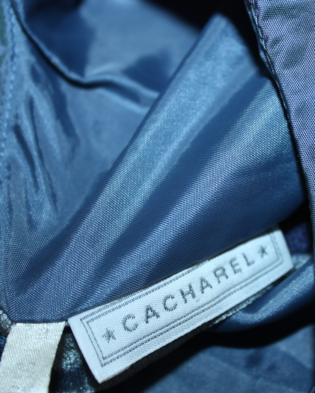 Superbe robe vintage Cacharel qui semble venue d'un conte de fée ! Sous le velours marine, un jupon de tulle et satin pour un beau volume et un col satiné en corolle. On la noue à la taille par un ruban de velours noir.