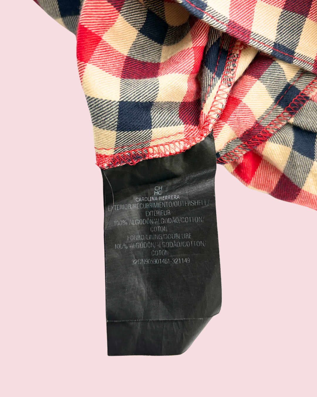 Robe Carolina Herrera à carreaux rouge et bleu marine, manches longues, avec volants délicats sur le devant et le dos, et deux poches pratiques. Elle peut se porter avec des collants en hiver.