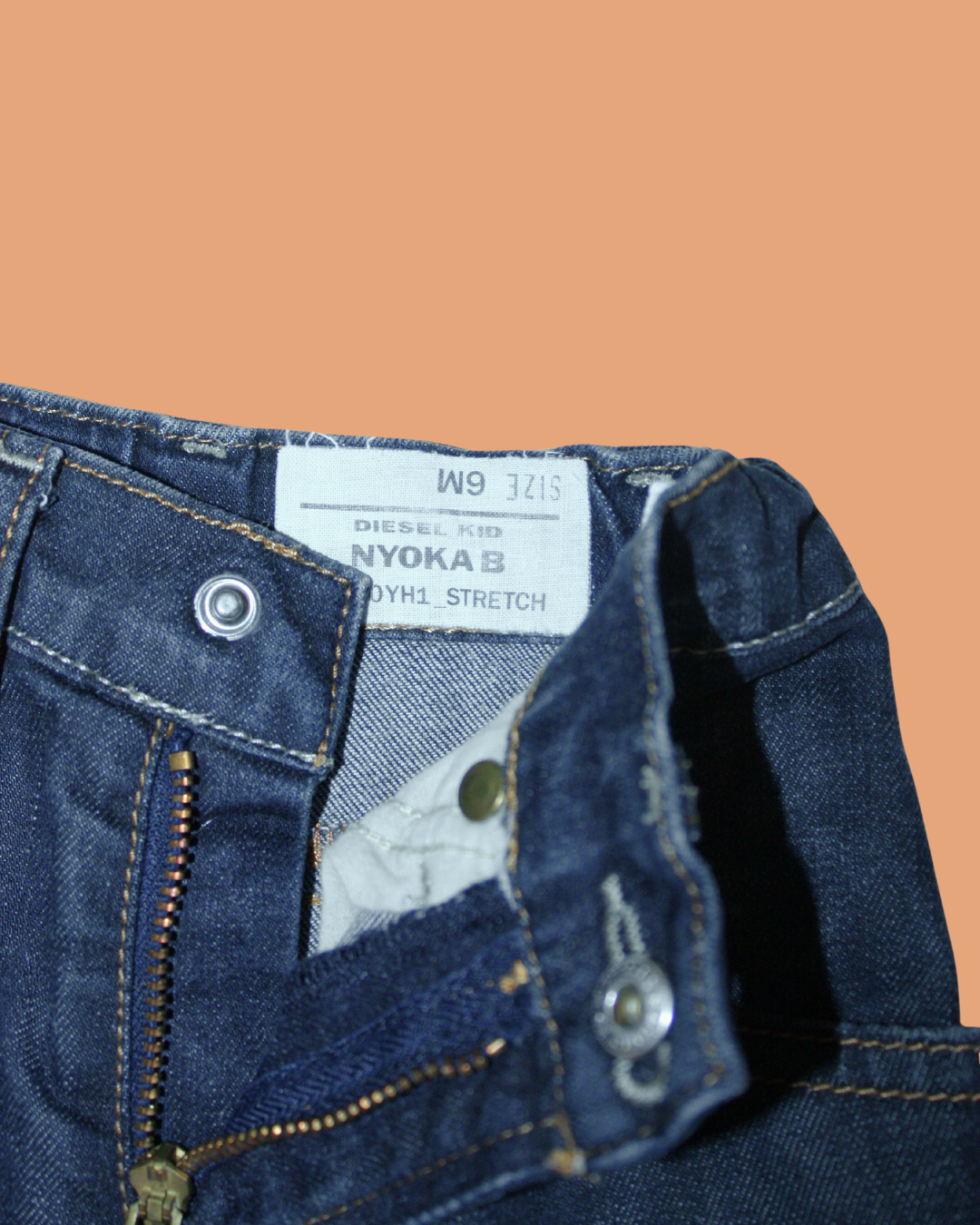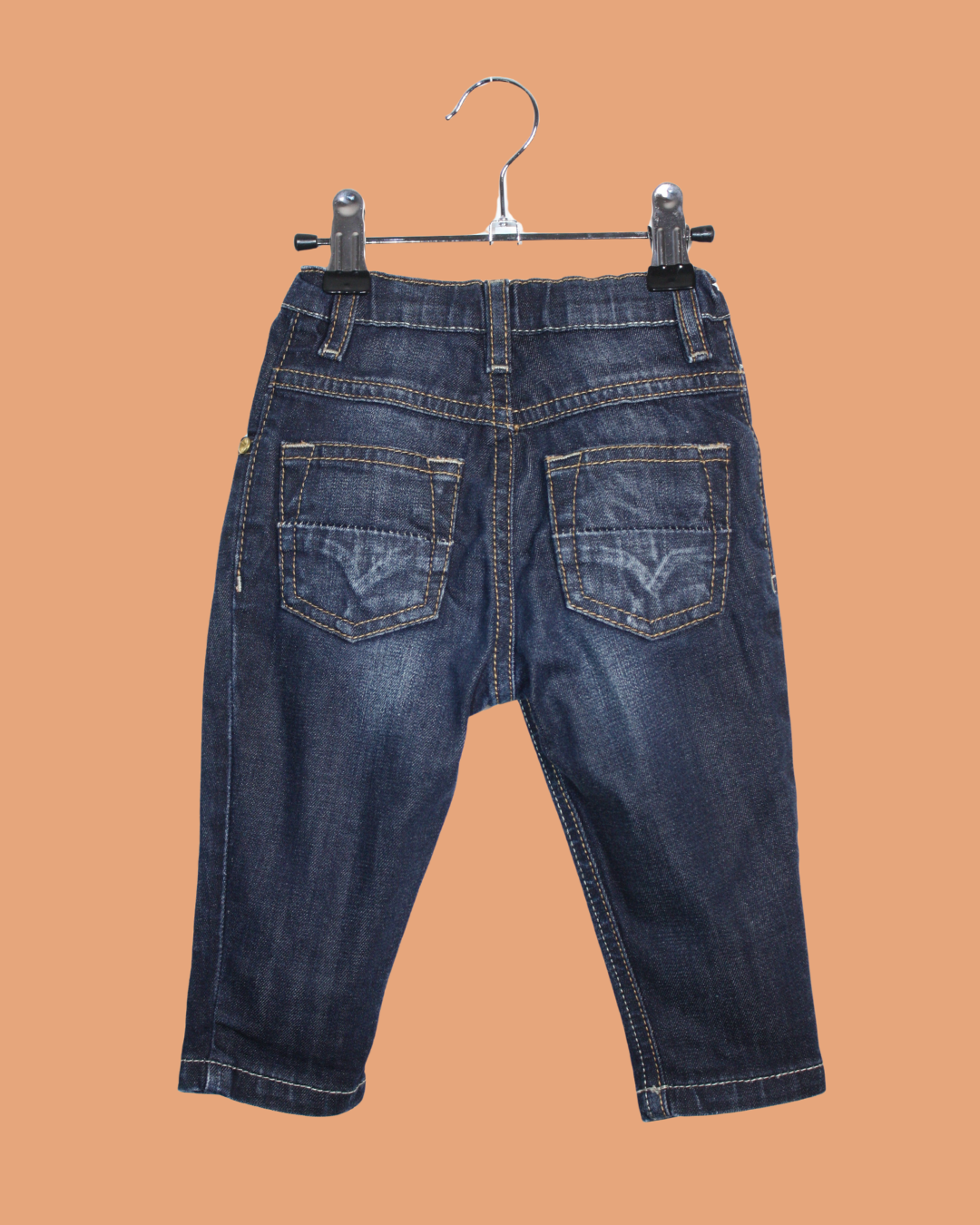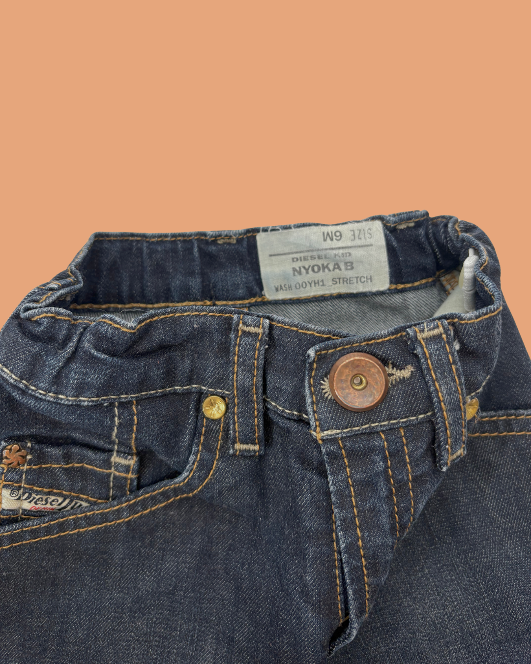 Super jean Diesel aux surpiqûres jaunes, une pièce indémodable qui se porte toute l’année ! Il a en apparence tout de celui des grands mais la taille est élastique, il contient un peu d'élasthanne pour le confort et le bouton de devant cache en réalité une pression pour faciliter l'habillage.