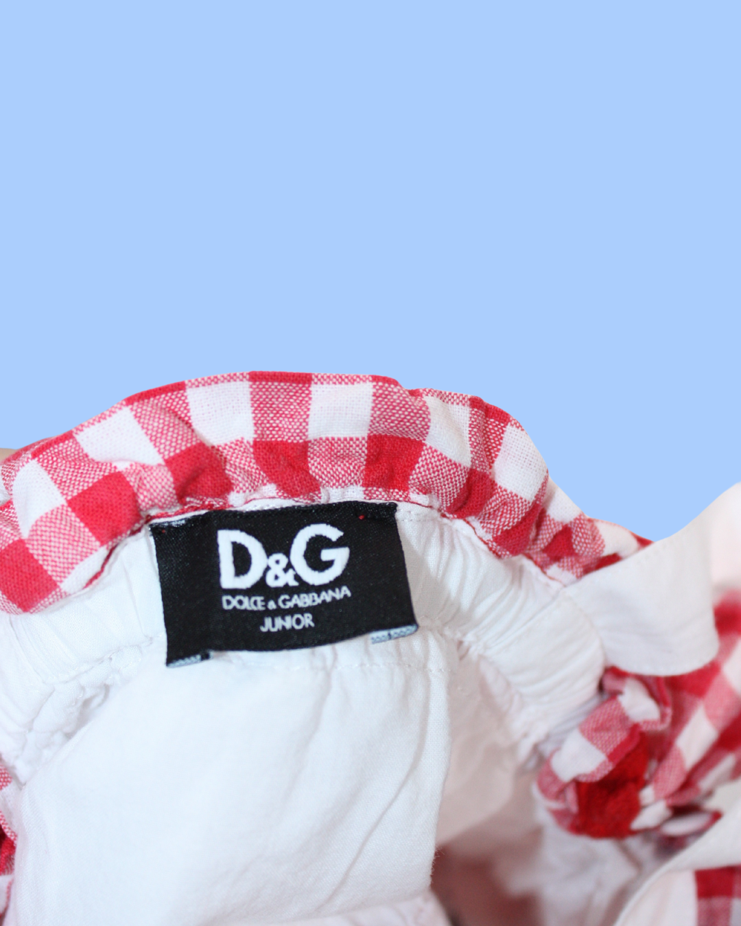 Robe légère Dolce & Gabbana avec des volants de coton en dentelle blanche et motif vichy, parfaite pour l’été.