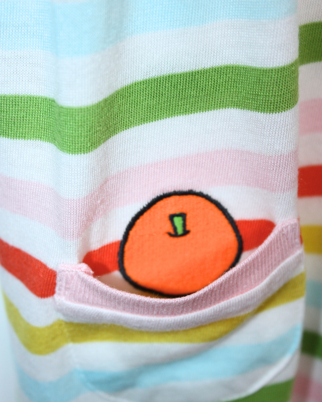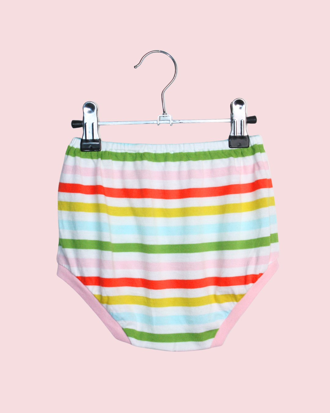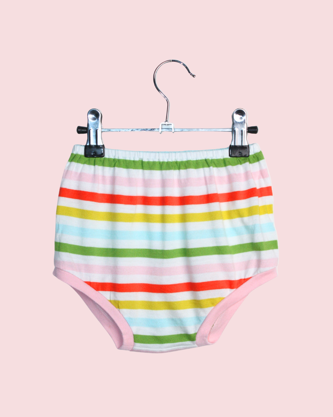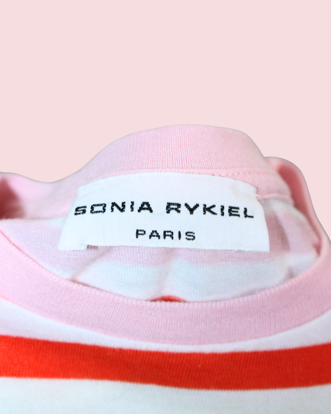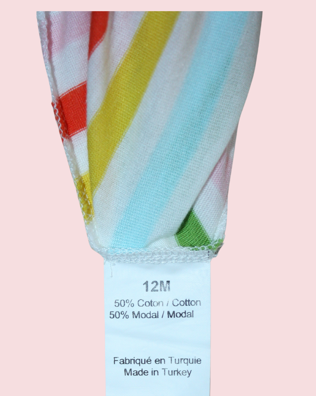 Jolie robe de marque Sonia Rykiel en coton doux. C'est un modèle aussi confortable que fun, avec un imprimé graphique multicolore - les rayures iconiques de la créatrice - et une culotte bloomer assortie.