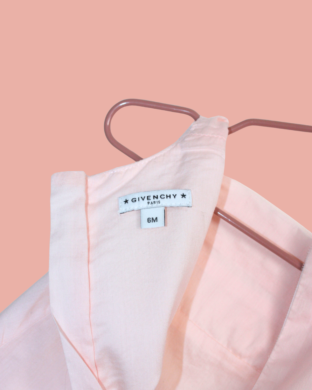 Superbe barboteuse Givenchy en coton doux rose / abricot. Elle arbore un faon très mignon imprimé sur le devant sous un plastron à petits volants. Elle s'ouvre dans le dos par fermeture à glissière et à l'entrejambe par des boutons à pression. Indispensable des premiers mois, la barboteuse allie style et confort.