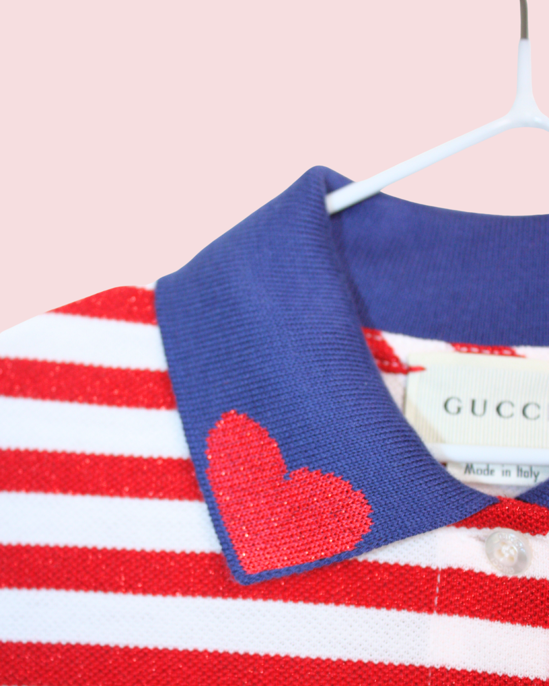 Cette superbe robe Gucci est confectionnée en piqué de coton à rayures rouges pailleté et blanches. Elle a un col et des manches polo et sa jupe est plissée. Sur le col des coeurs rouges à paillettes et dans la nuque une broderie Gucci.