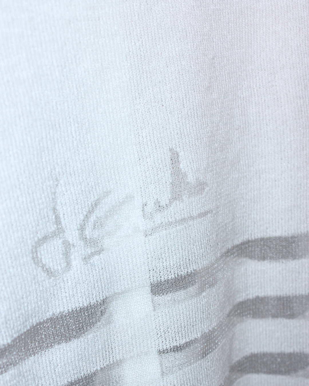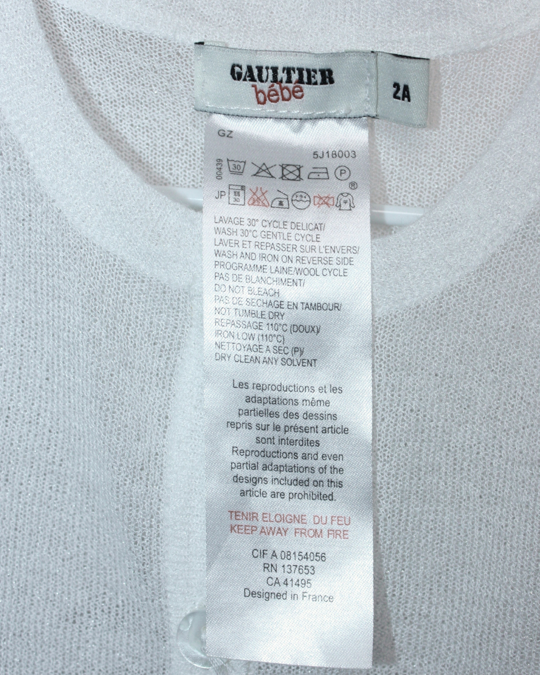 Superbe gilet Jean Paul Gaultier pour les enfants : en maille fine blanche, dans un esprit marinière cher au couturier français, il joue avec des effets de transparence au niveau des rayures et de sa signature dans le dos.
