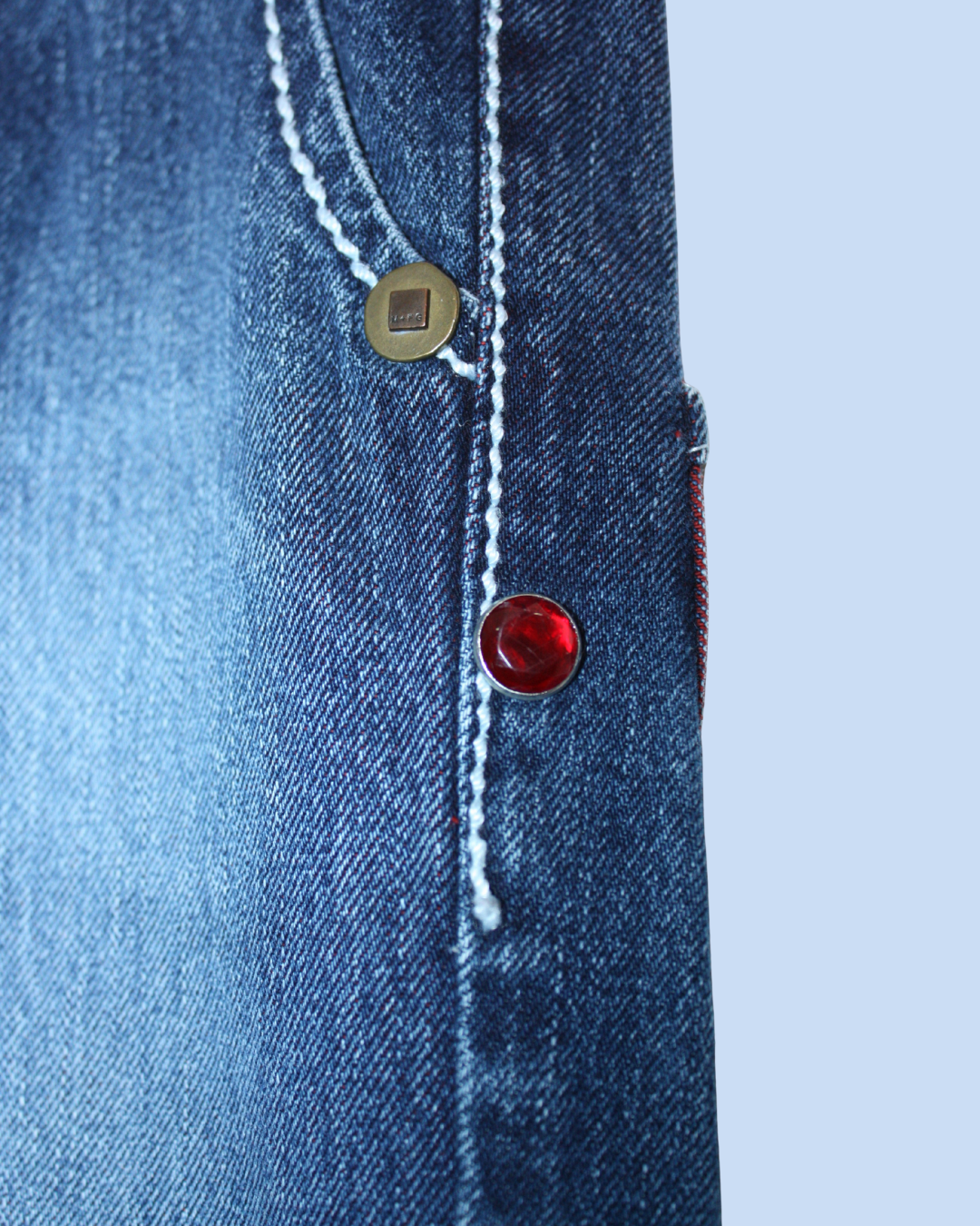 Jean ultra stylé Marithé et François Girbaud, avec déchirures aux genoux et aux poches arrière, agrémentées de fils rouges et blancs. Taille élastique ajustable avec boutons et passants pour ceinture. Un jean audacieux et résolument tendance.