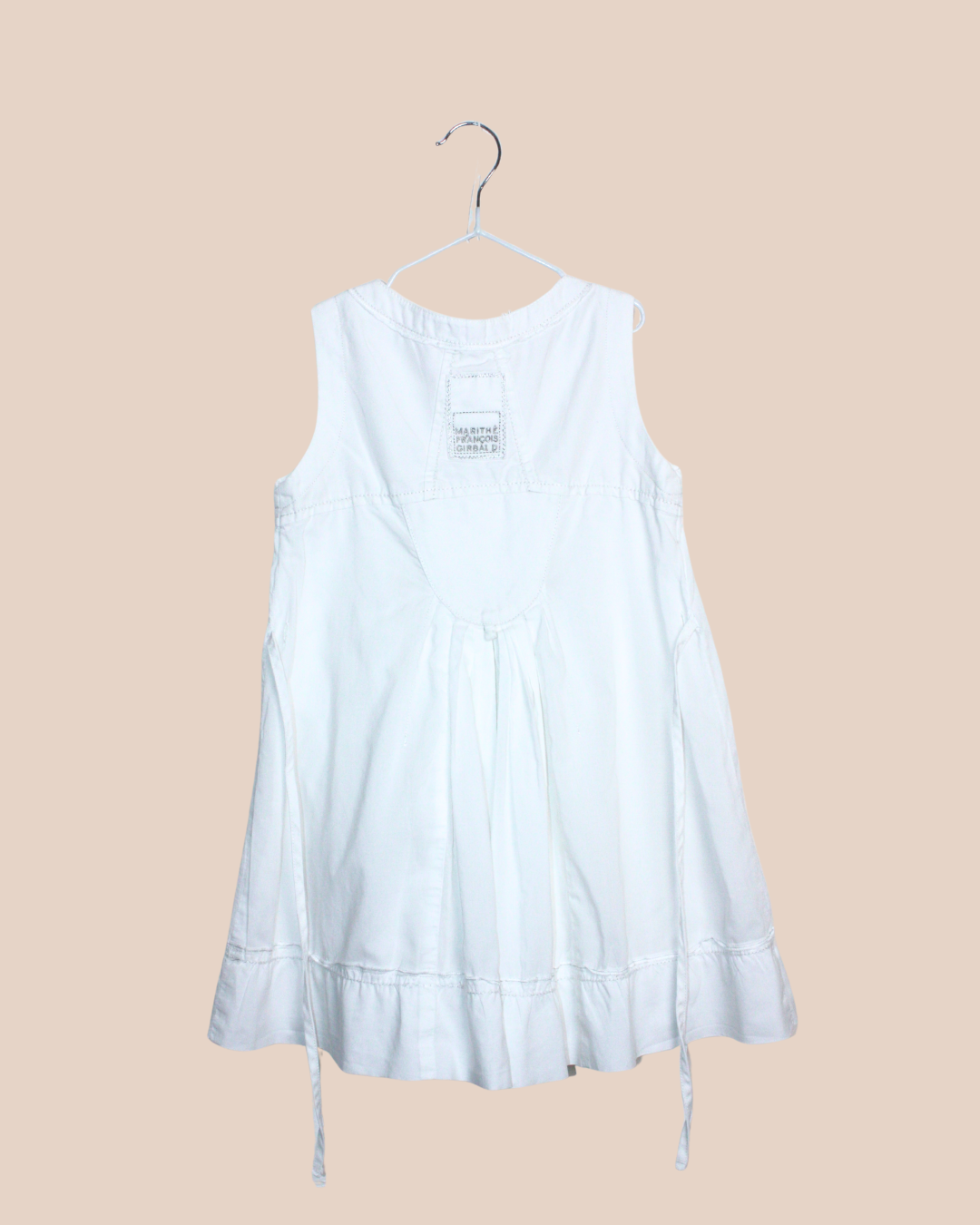 Élégante robe blanche Marithé et François Girbaud, dotée d’une boutonnière sur le devant et de deux poches passepoilées. Elle peut être ceinturée à l’avant ou à l’arrière selon le style souhaité. Le dos est orné de jolis plis et de la marque brodée en fil argenté. Une pièce raffinée, parfaite pour une occasion spéciale.