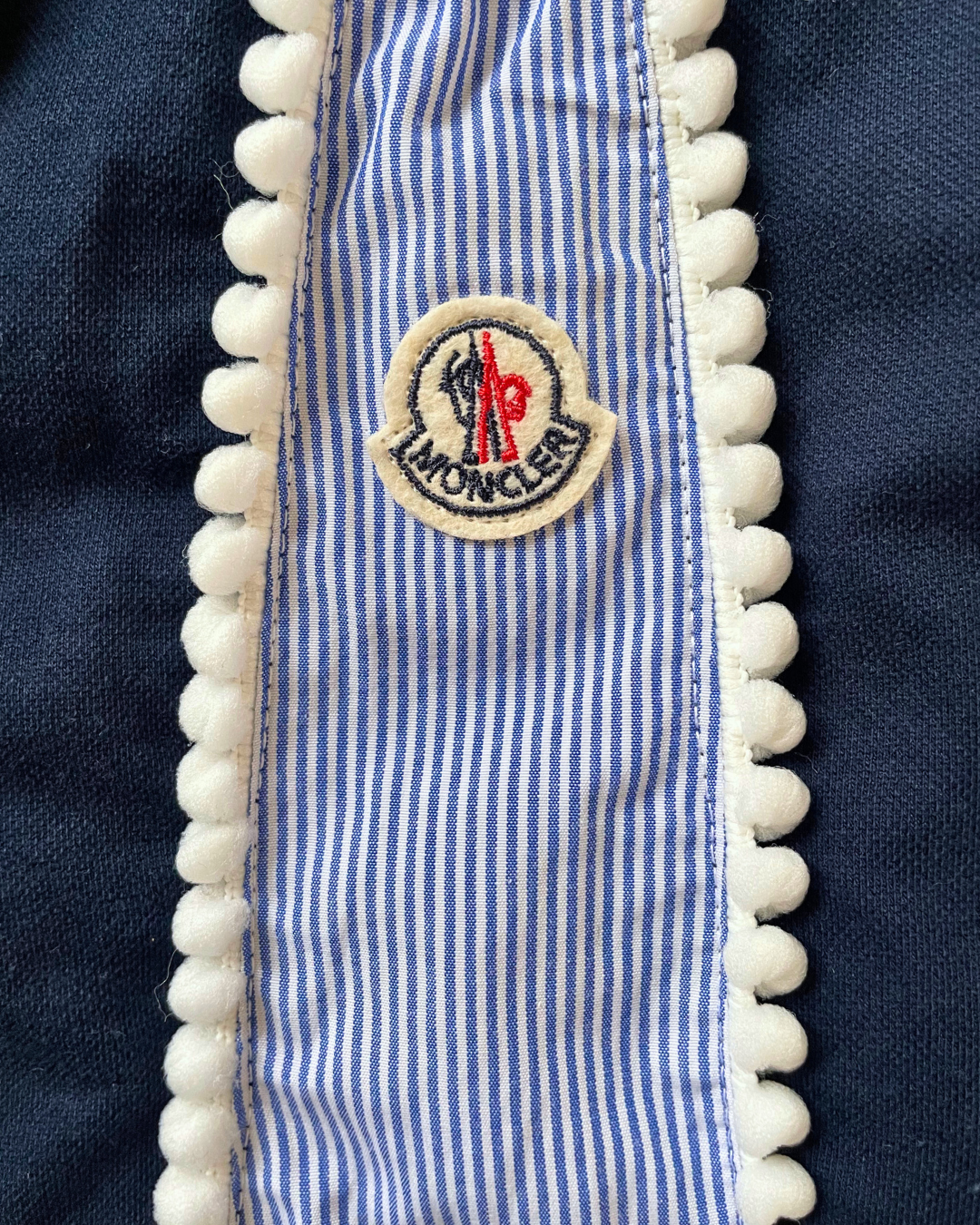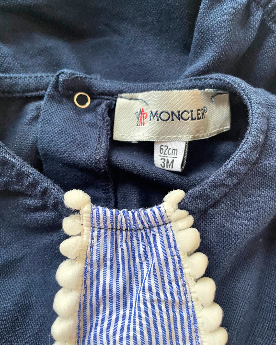 Superbe barboteuse Moncler en coton. Elle est bleu marine avec un empiècement à rayures bleues claires et blanches assortie du logo en feutre. Il s'ouvre dans le dos et à l'entrejambe par des boutons à pression. C'est une pièce bien pratique pour les tous premiers mois.