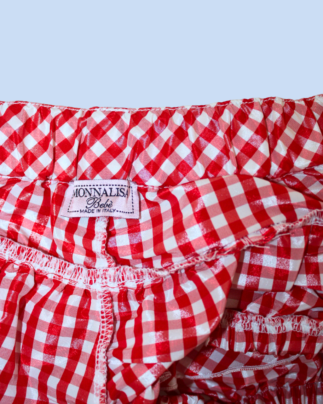 Joli short bloomer vichy de la marque italienne de luxe pour enfants Monnalisa. Confectionné dans une matière brillante, il est décoré d'un volant.