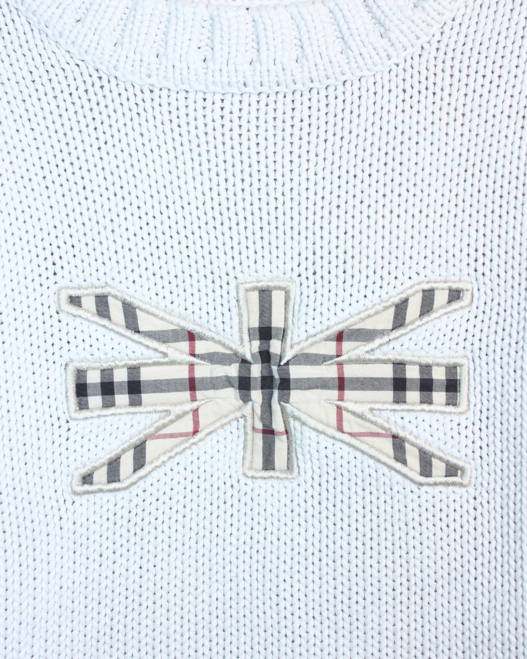 Super pull Burberry couleur écru en coton tricoté. Il arbore le drapeau britannique en tartan check, le motif iconique Burberry.