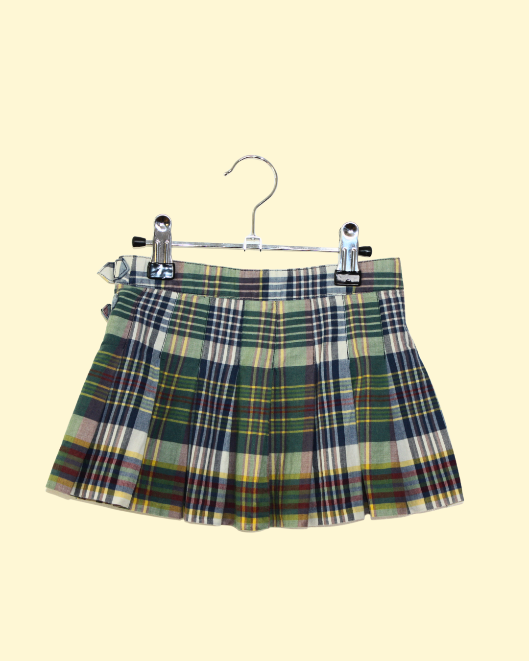 Jolie jupe plissée à carreaux Ralph Lauren dans les tons de verts, jaune , bleu et bordeaux. Elle sera parfaite pour un look de rentrée dans le style preppy cher à la marque américaine. Elle se ferme en portefeuille par deux boucles qui ajoutent du style à la jupe. Sa taille peut être adaptée par des pattes de serrage élastiques