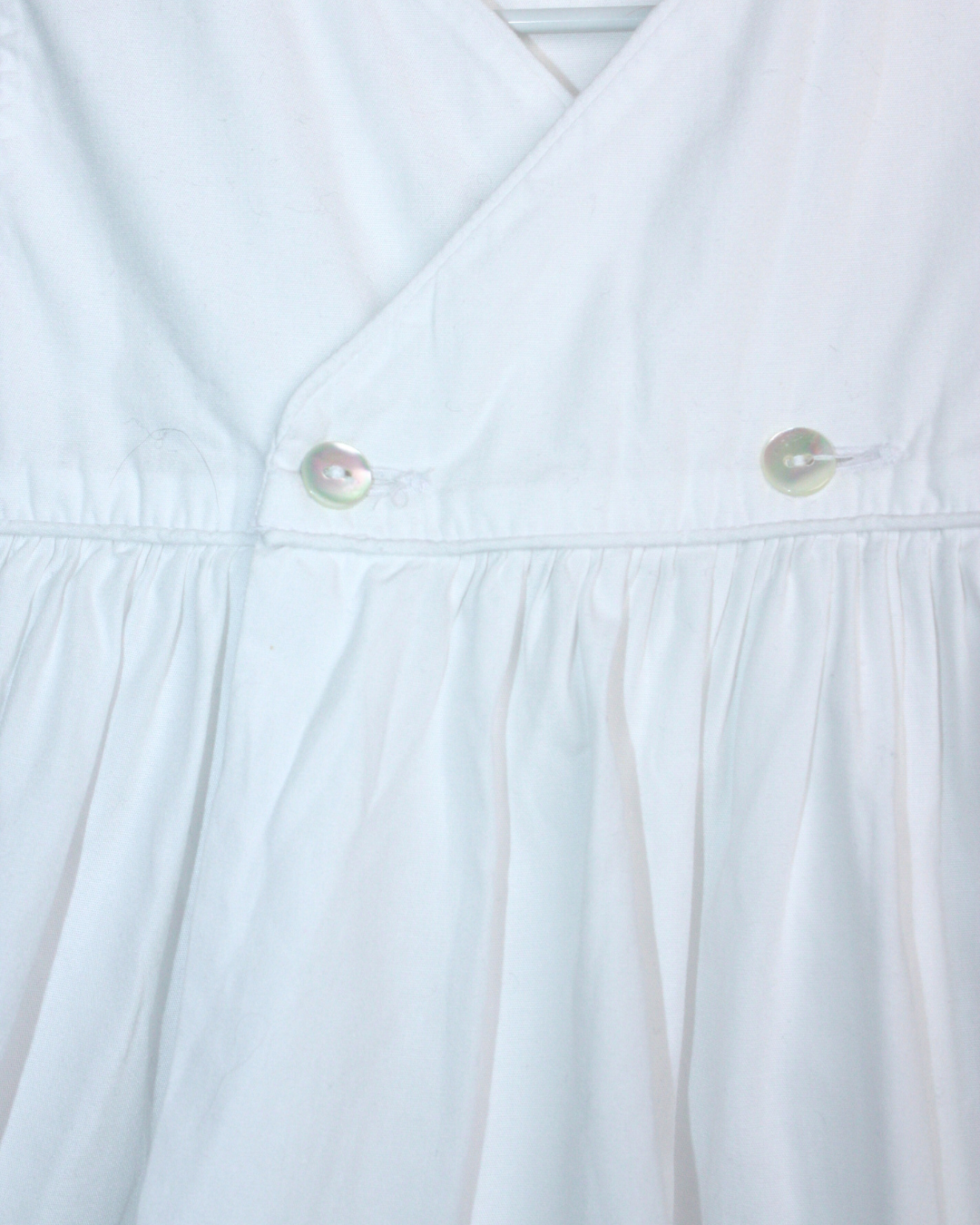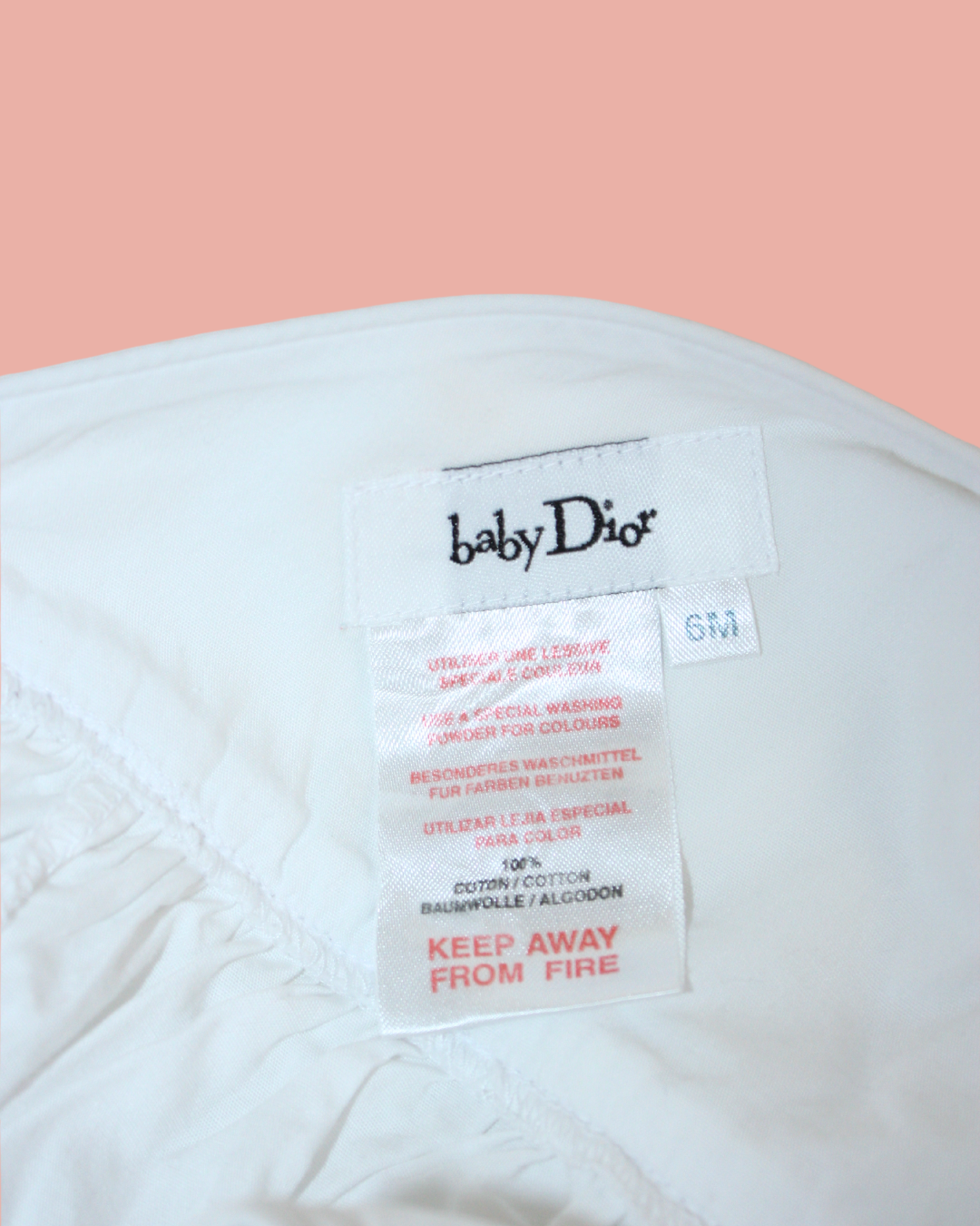 Superbe robe Baby Dior en coton blanc avec une barboteuse intégrée. Le col est croisé en cache-cœur, décoré par un nœud en satin pastel et illustré d'une branche de cerisier en fleurs.