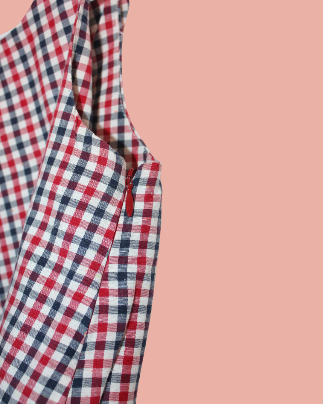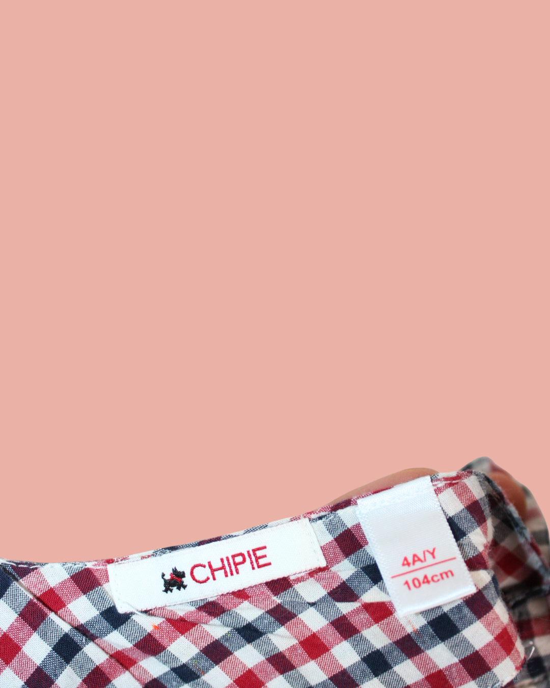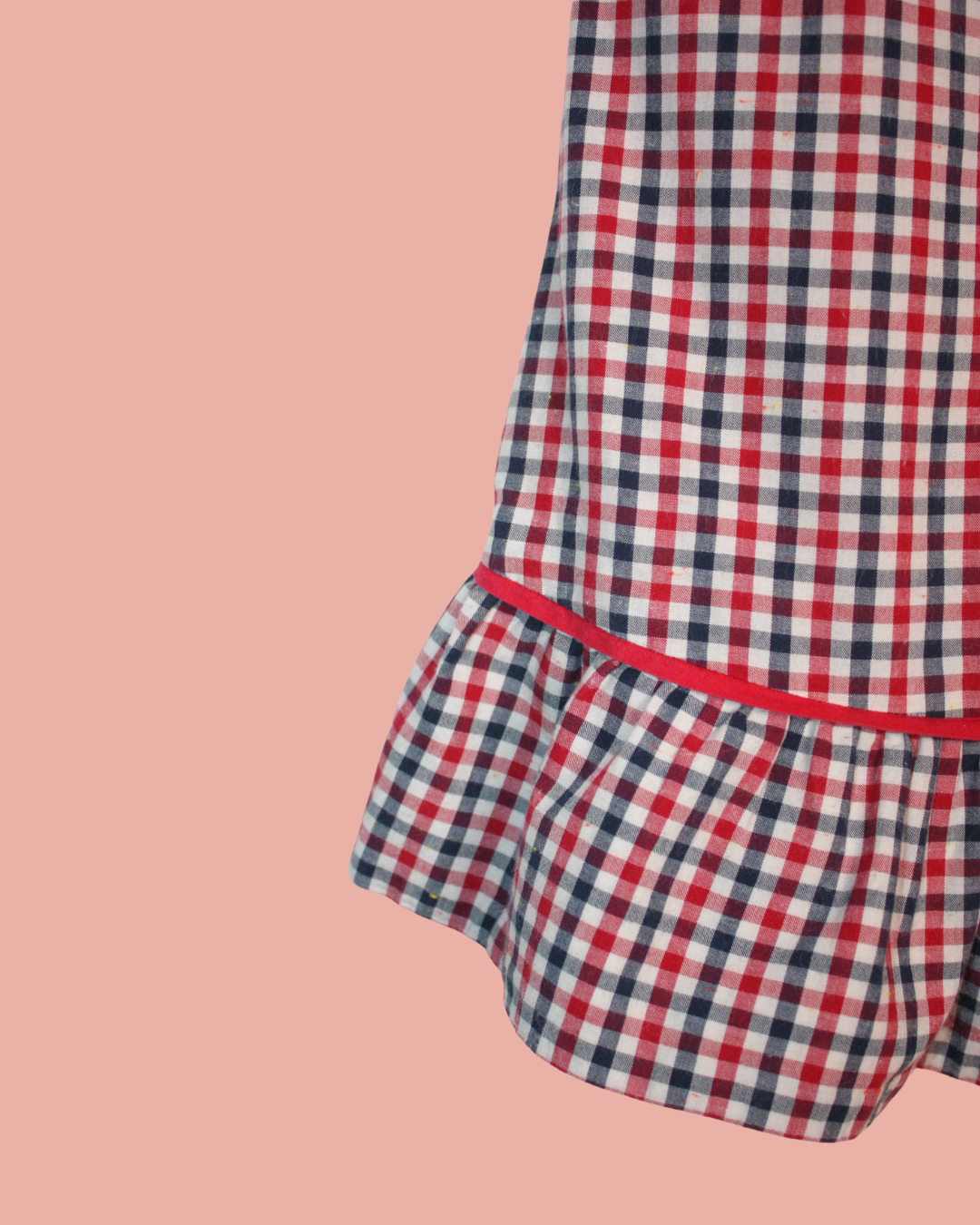 Robe vintage 90s Chipie à motifs vichy rouge et bleu marine, ornée de nœuds sur les bretelles et d’un volant sur le bas. Le petit chien ‘Chipie’ est brodé sur le devant, accompagné d’une plaque au nom de la marque. Doublée, elle sera parfaite pour la mi-saison.