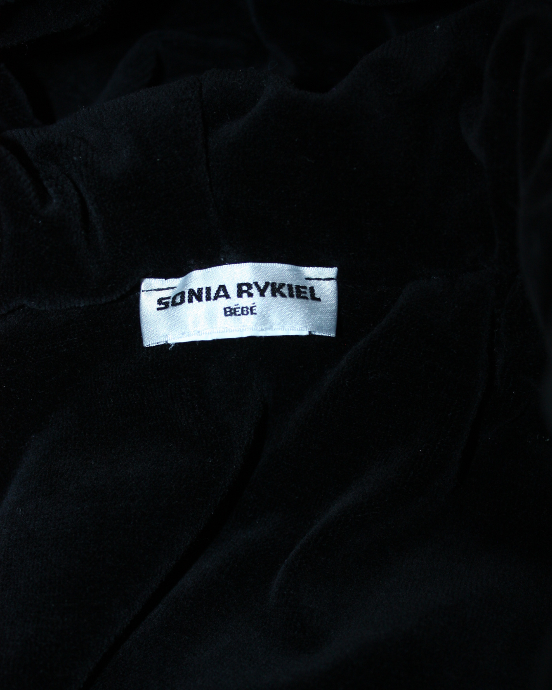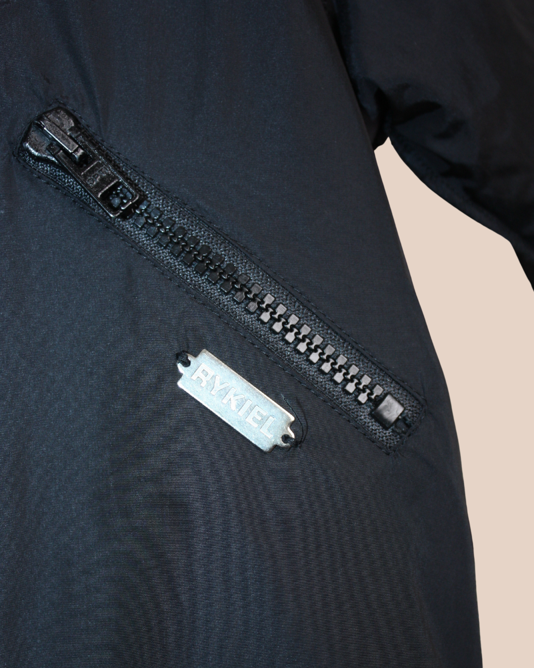 Superbe combinaison pilote noire Sonia Rykiel avec "Just for me" brodé dans le dos. Elle est fourrée de velours noir tout doux à l'intérieur et possède une capuche bien pratique en cas d'intempéries.