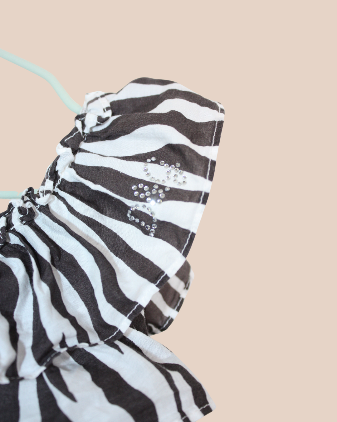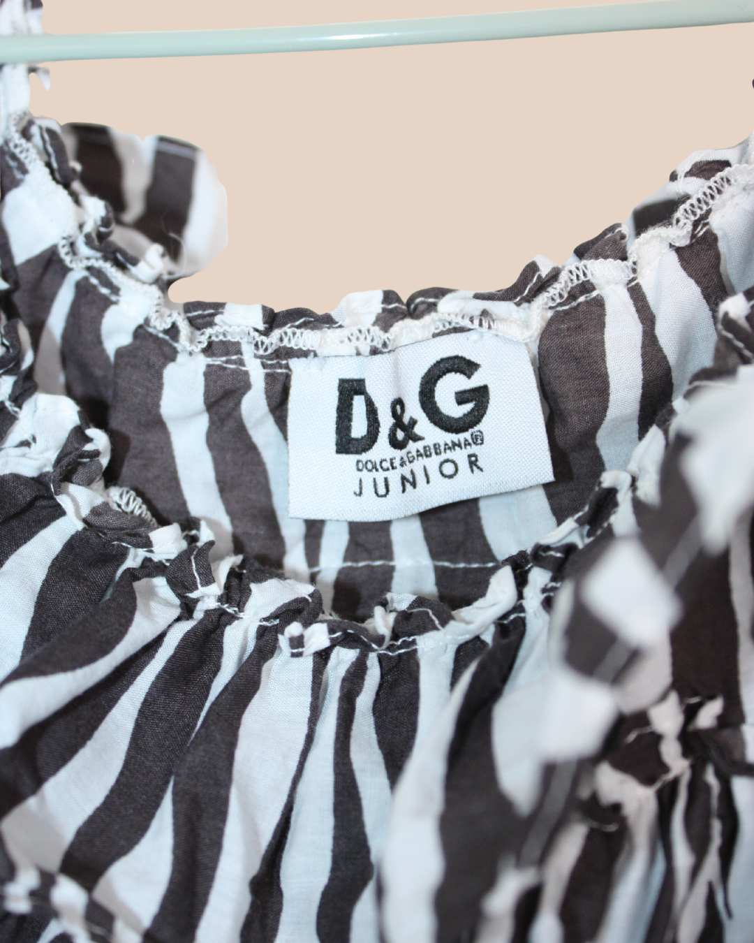 Super top zébré 🦓 Dolce et Gabbana en taille 4 ans. En coton donc facile à entretenir, il est composé de plusieurs niveaux de volants et arbore les initiales de la marque en strass sur une épaule.