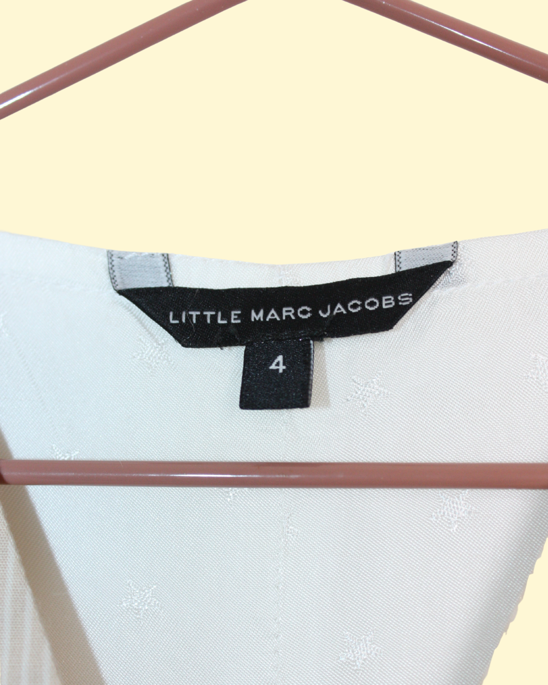 Joli top Marc Jacobs façon gilet de costume en deux matière : toile de coton rayée beige devant et satin étoilé dans le dos. A porter avec une chemise et un jean.